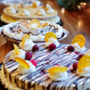 • Chocolate Peppermint Pie – Chocolate Peppermint ice cream, over a chocolate cookie crust, topped with whipped cream frosting, peppermint, and chocolate sauce.